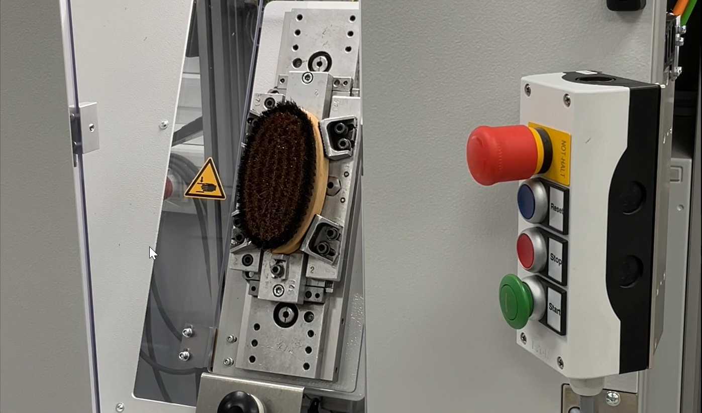 Die Bürsten sollten manuell eingelegt werden können, um unterschiedliche Varianten flexibel bearbeiten zu können. Gleichzeitig war es erforderlich, den gesamten Bearbeitungsprozess automatisiert und sicher auszuführen, um den Bediener zu schützen und Bedienfehler zu vermeiden.