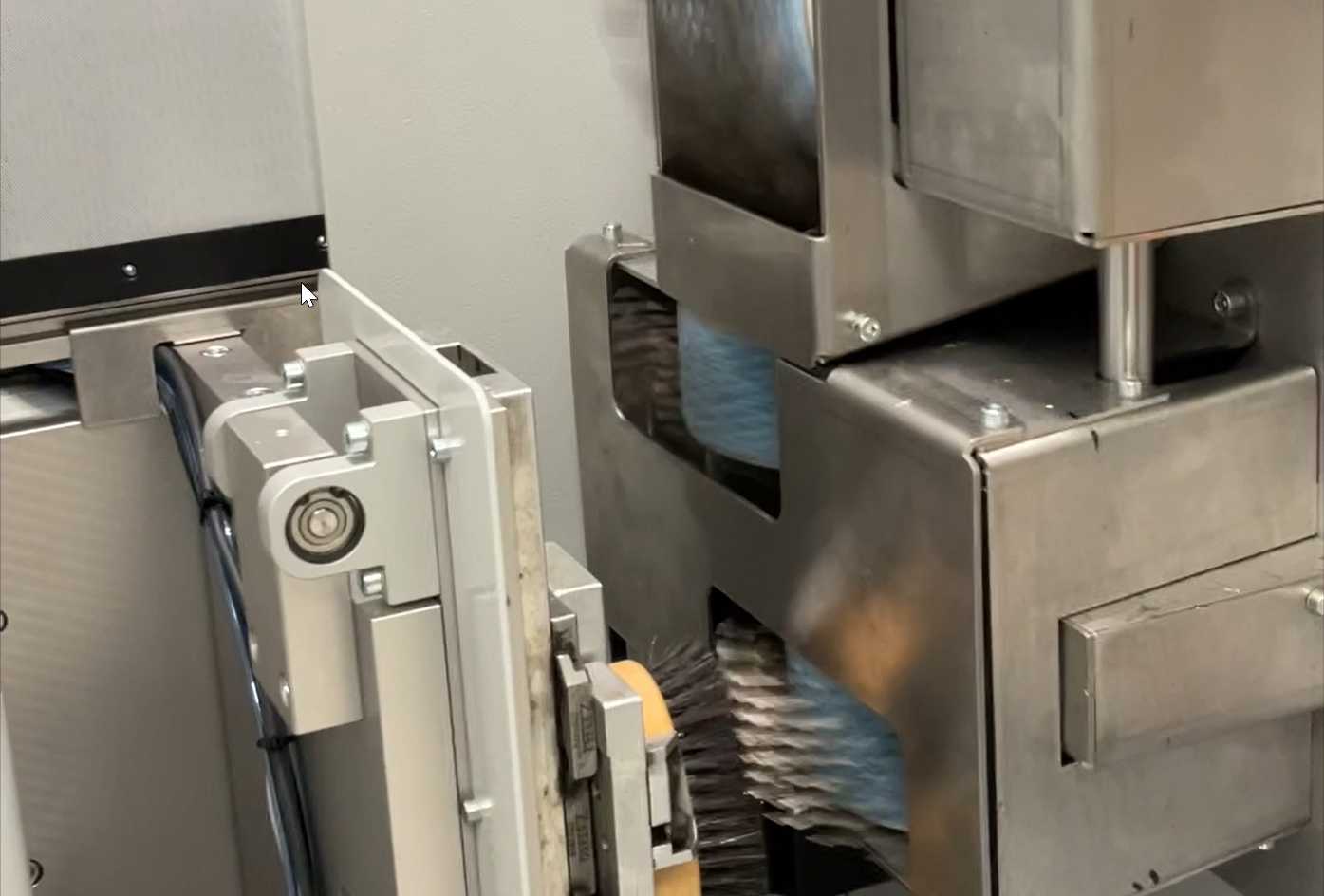 Eine horizontal ausgerichtete Drahtbürste entfernt grobe Rückstände, während eine vertikal ausgerichtete Bürste die Bürstenstruktur gezielt in einer anderen Bearbeitungsrichtung reinigt. Eine dritte, gegenläufig rotierende Drahtbürste sorgt für eine gleichmäßige Feinreinigung.