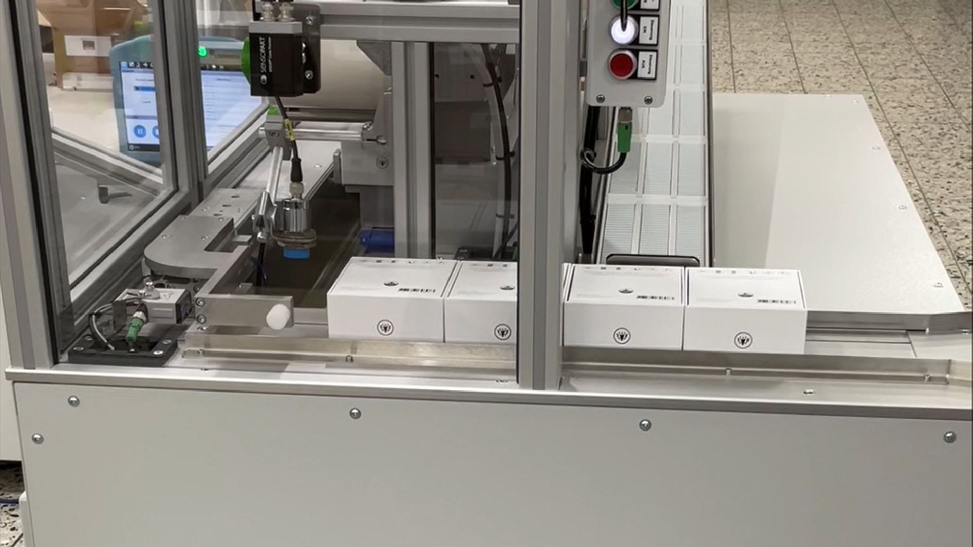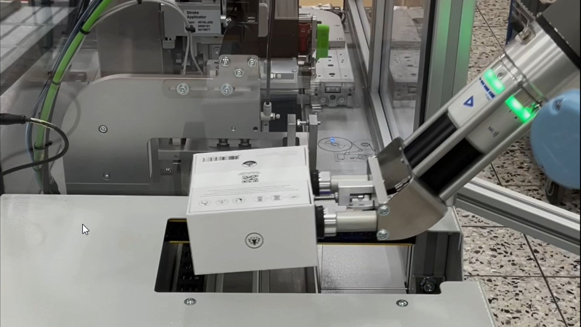 Nach dem Einlegen der Produkte erfolgt die positionsgenaue Etikettierung. Ein integrierter Roboter übernimmt die Verpackungen anschließend direkt und legt sie reproduzierbar im vorgesehenen Versandkarton ab. Nach vollständiger Bestückung wird automatisch ein individuelles Versandetikett erstellt und aufgebracht.